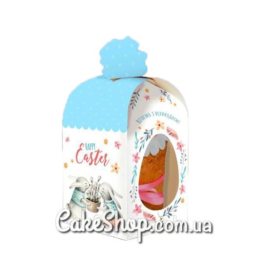 Цена на Коробка для пасхальных куличей 11х11х14 см, Зайцы с вербой голубая равна 20 грн.