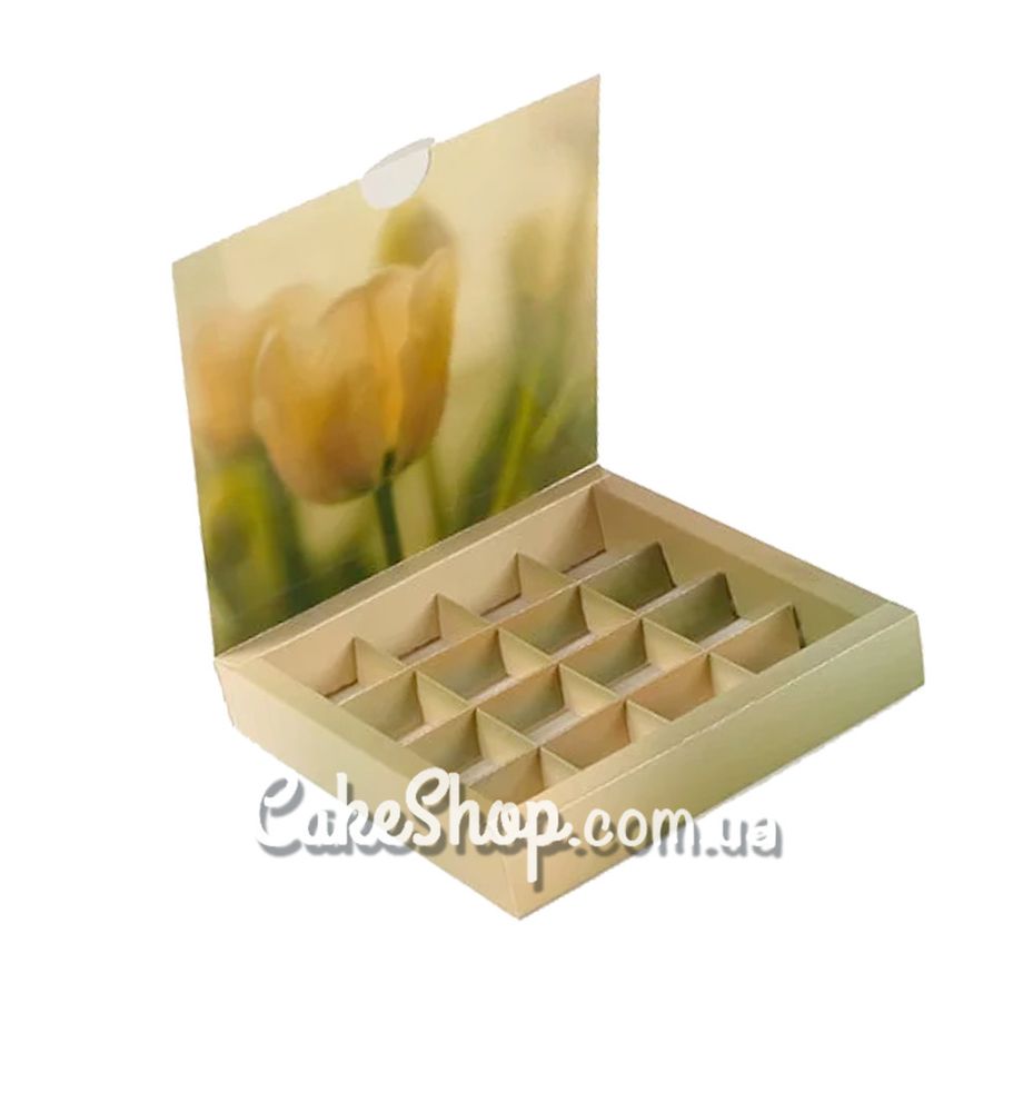 Цена на Коробка на 16 конфет без окна Тюльпан весенний, 18,5х18,5х3 см равна 30 грн.