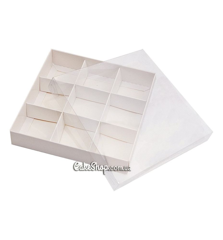 Цена на Коробка на 9 конфет с прозрачной крышкой Белая, 15х15х3 см равна 18 грн.