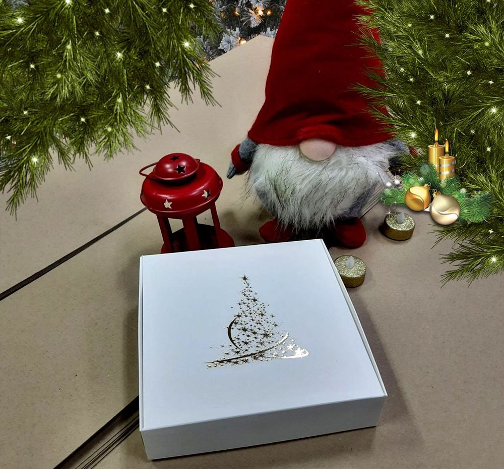 Цена на Коробка для пряников Елка с золотым тиснением, 20х20х5 см равна 18 грн.