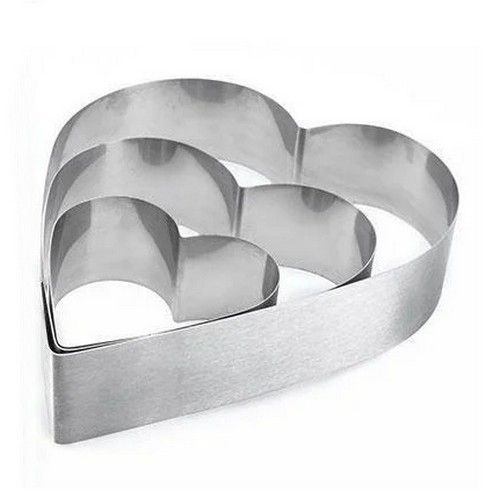 Этот набор форм может быть использован, как для сборки тортов, так и для их выпечки, а также в качестве формы для заливки желе, суфле и муссов и т.п. С помощью данных форм можно испечь лепешки разных размеров формы сердца. Вам просто необходимо установить данную форму на противень, подложить бумагу для выпечки, хорошо обжать её фольгой и выпекать. Можно также использовать для формирования салатов и гарниров.