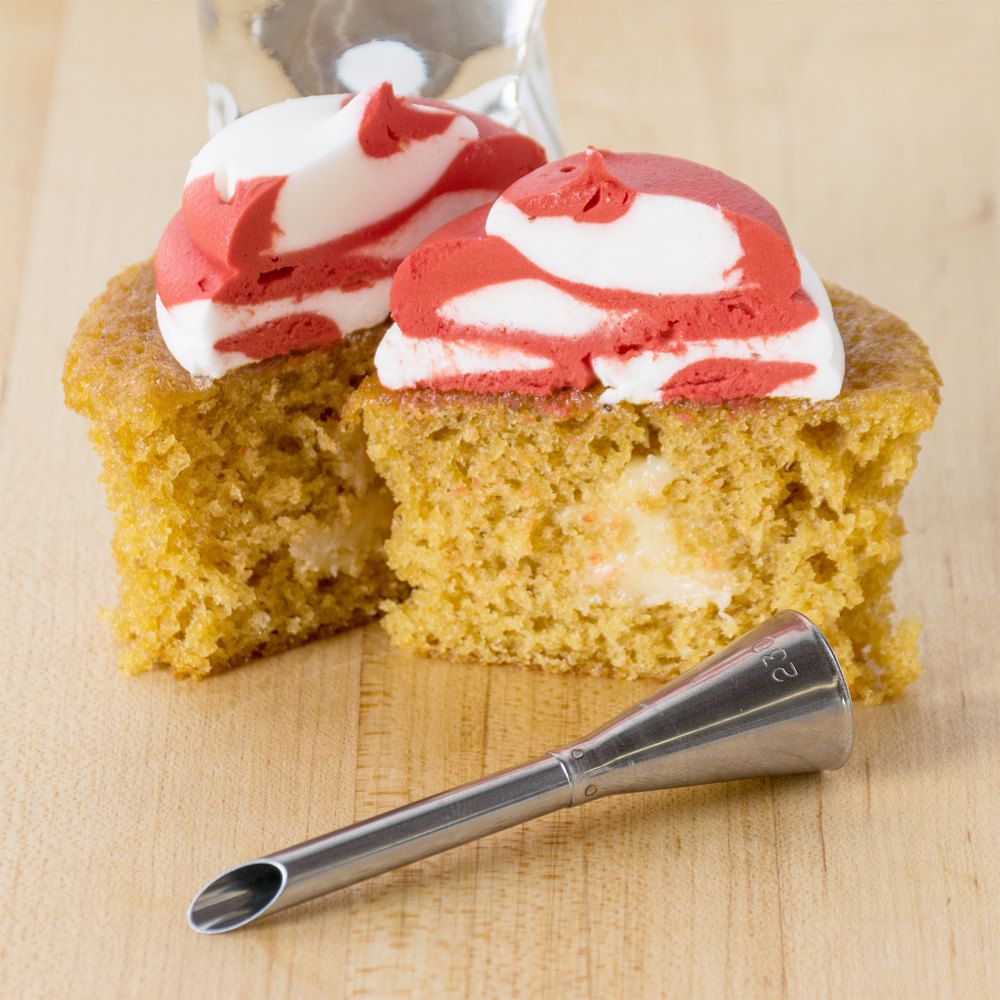 Насадка Ateco # 230 имеет небольшое отверстие, но выполнена в виде длинной трубочки, при помощи которой удобно наполнять кремом эклеры, маффины, капкейки и другие изделия. Моджет использоваться для работы с тестом.