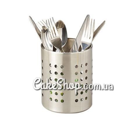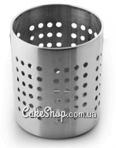 Подставка (сушилка) для столовых приборов изготовлена из высококачественной нержавеющей стали, имеет цилиндрическую форму. На стенках подставки небольшие круглые отверстия.