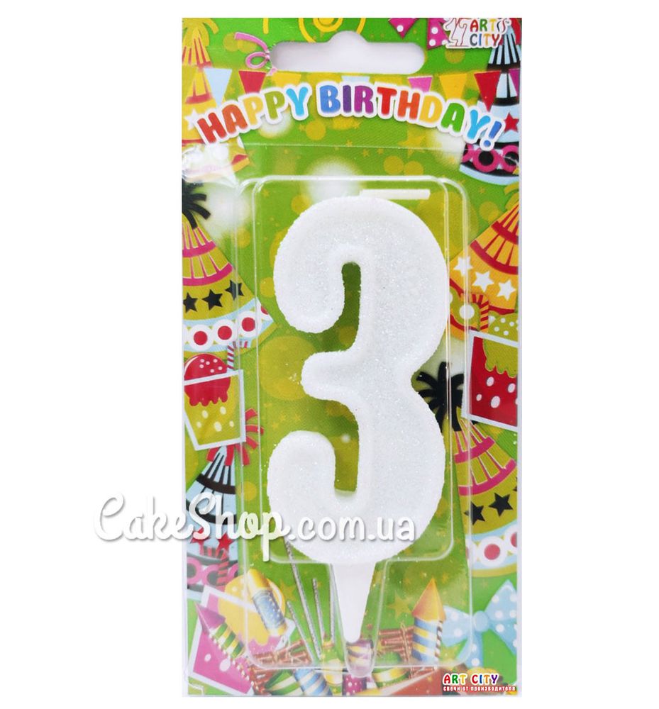 Цена на Тортовая свеча цифра Классика белый блеск - 3 равна 12 грн.