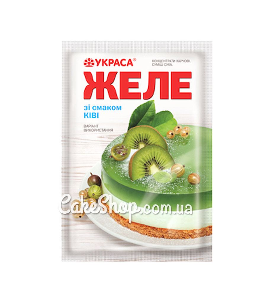 Желе фруктовое, небезызвестный десерт с широким кулинарным использованием, готовят как индивидуальный десерт совмещенный с разнообразными фруктами, также как декор для кондитерских изделий, прослойка для тортов, декоративный наполнитель для загущенных сметанных кремов с эффектом «битое стекло», сочетают с другими видами желе. Желе ТМ «Украса» готова смесь для домашнего приготовления фруктового желе со вкусом киви. ТМ «Украса» с проверенной, надежной рецептурой, качественными пищевыми ингредиентами, натуральными красителями и порошком экстрактом сухого сока киви. Готовится очень просто и быстро, нужно только добавить воды согласно рецептуре, хотя данная смесь подходит для приготовления сливочного желе с ароматом киви, нужно вместо воды добавить молоко или сливки. С желе ТМ «Украса» потребитель всегда уверен в полезном, вкусном и положительном конечном приготовленном результате. Для приготовления десерта с сочетаниями других цветов рекомендуем фруктовое желе других вкусов и цветов ТМ «Украса».