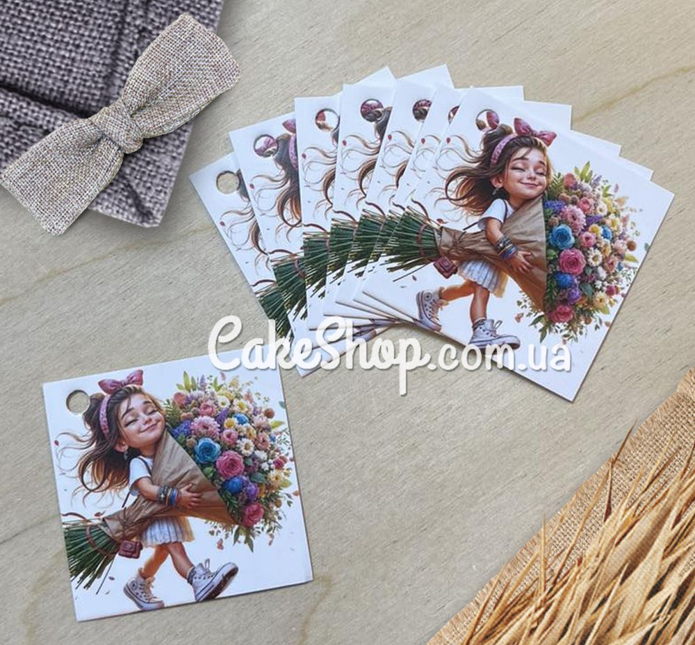 Бірка паперова Дівчинка з букетом 5х5 см, 10 шт