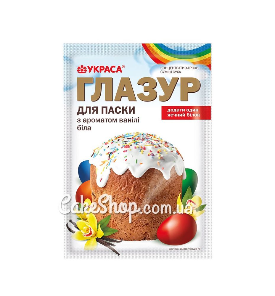 Ціна на Глазур для паски з ароматом ванілі Украса біла, 75 г дорівнює 18 грн.