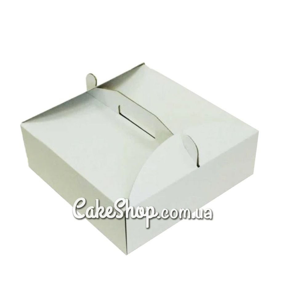 Коробка з білого мікрогофрокартону - зручна упаковка для торта, випічки та інших кондитерських виробів. Коробка самозбірна з жиро- і вологостійкого матеріалу. Складається з двох окремих частин, які складаються в цілу коробку, не вимагаючи додатково склейки. У коробці є ручка для більш зручного транспортування.