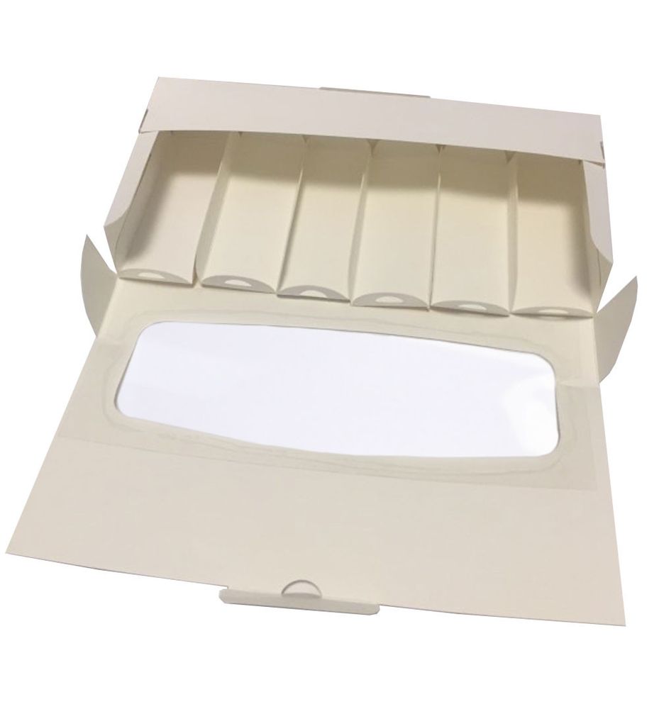 Картонна коробка з прозорим вікном під еклери, торти, муссовие тістечка і тістечка-ескімо. Містить вкладиші - ложементи (6 шт - 137 мм * 48 мм), завдяки яким тістечка надійно фіксуються в коробці, що не зміщуючись при транспортуванні, а також легко витягуються з неї.
