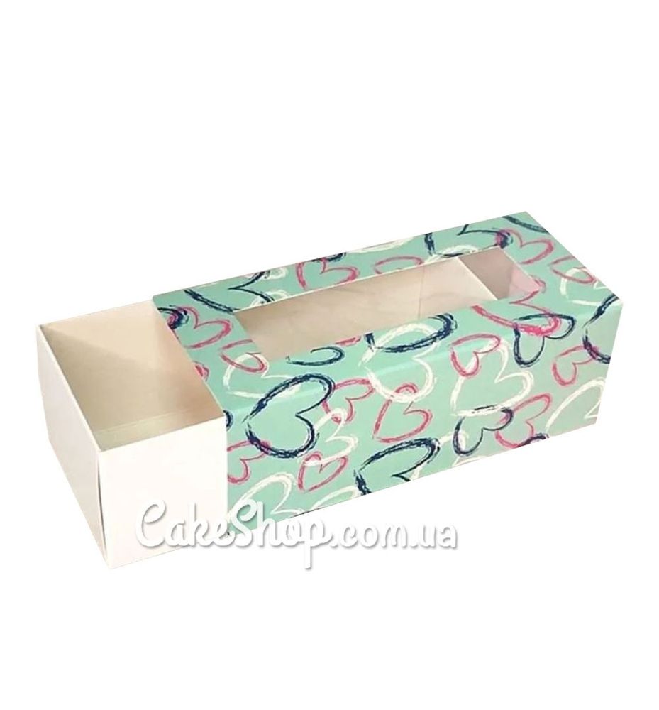Ціна на Коробка для макаронс, цукерок, безе з прозорим вікном Серця тіффані, 14х6х5 см дорівнює 15 грн.