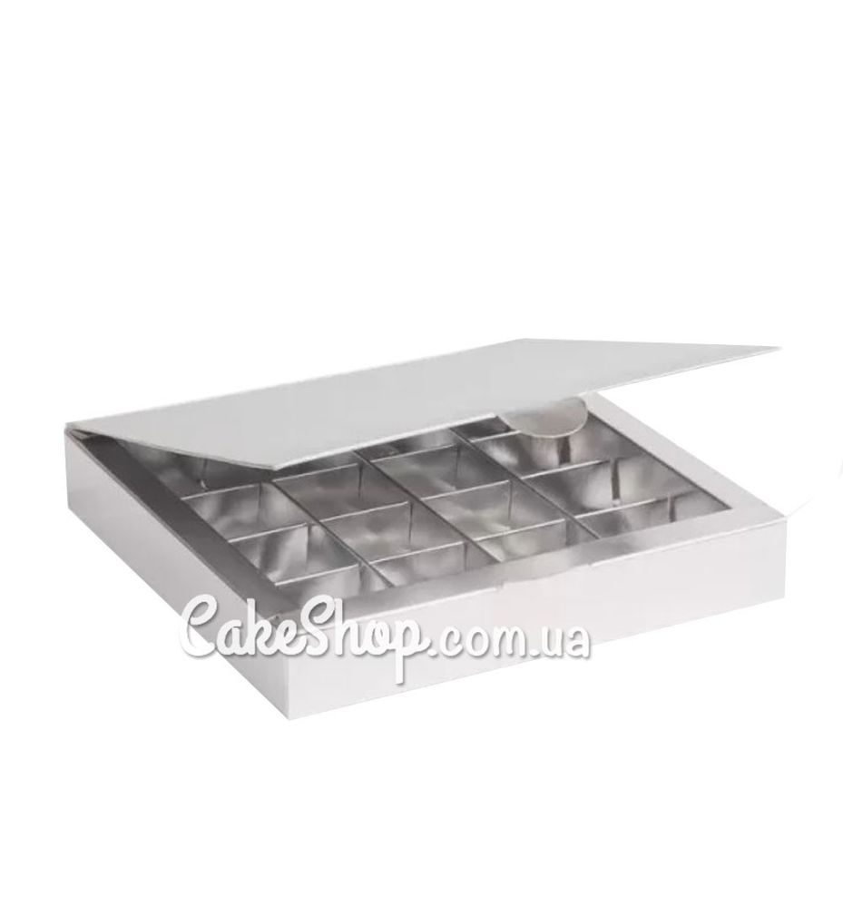 Ціна на Коробка на 16 цукерок без вікна Срібло, 18,5х18,5х3 см дорівнює 30 грн.