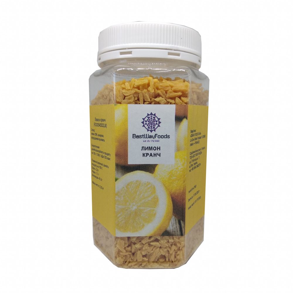 Кранч «Лимон» виготовлений з натуральних інгредієнтів методом сублімації сушіння (FD - сублімація), що надає продукту специфічну хрустку текстуру. Продукт не містить барвників, консервантів або генетично модифікованих інгредієнтів.