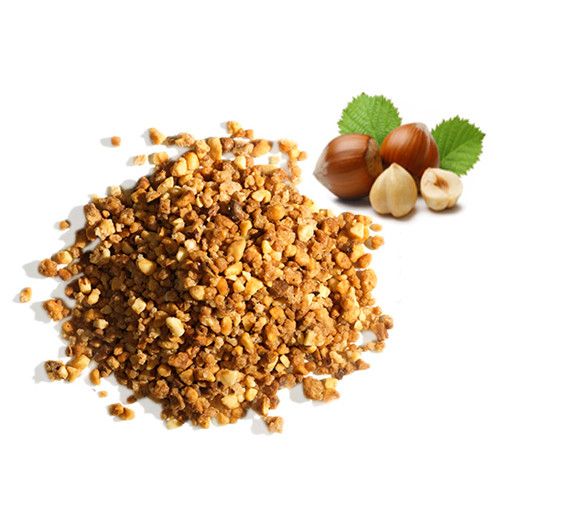 Обсмажений і подрібнений фундук, покритий золотистою, хрусткою карамеллю.