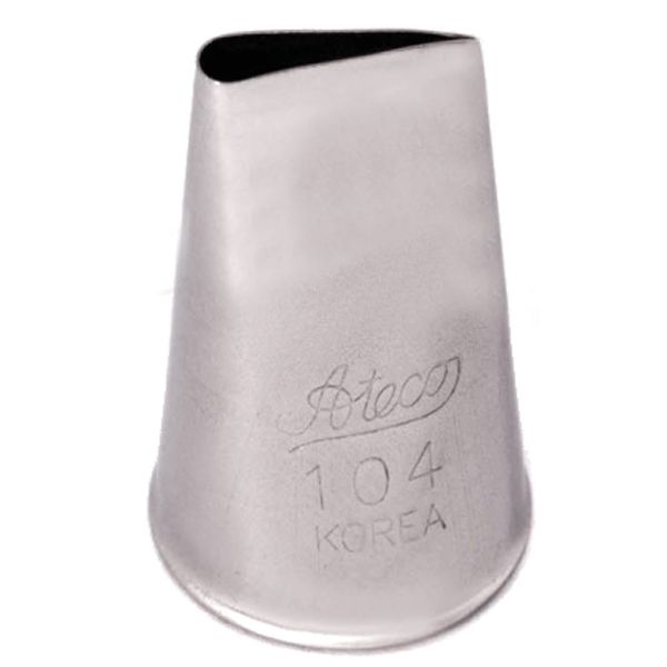 Насадка Ateco # 104 призначена для створення реалістичних прикрас у вигляді пелюстків троянд, квітів троянд, драпіровок, рюш, ламбрекенів, і бантів.