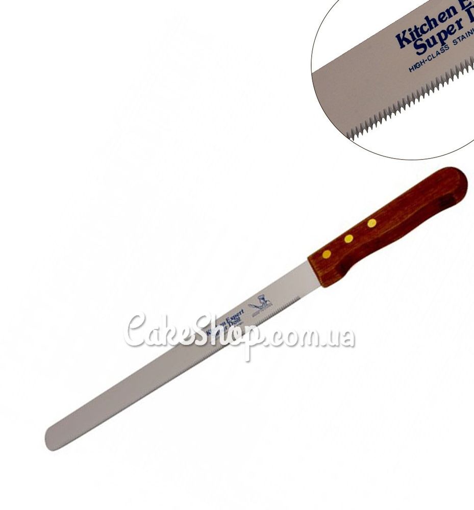 Кондитерський ніж з дрібним зубчиком і дерев'яною ручкою, виготовлений з нержавіючої сталі. Такий матеріал не окислюється, не вбирає в себе запахи продуктів.