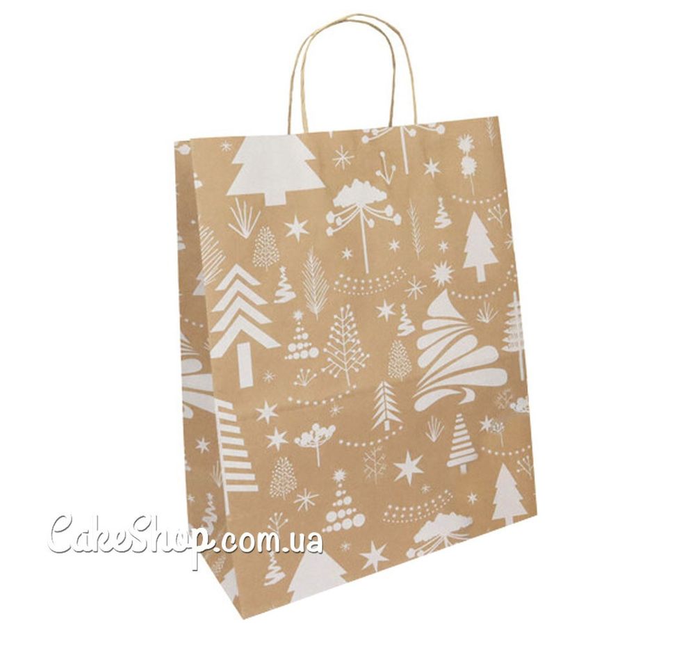 Ціна на Пакет паперовий з крученими ручками Крафт новорічний, 35х26х15см дорівнює 18 грн.