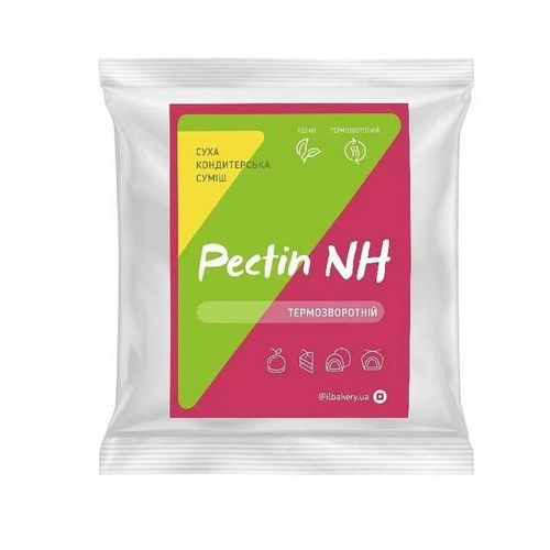 Пектин NH – це пектин термозворотній, при нагріванні він розчиняється, надаючи масі рідку консистенцію, а при охолодженні застигає, тобто масу з ним можна повторно нагріти і знову перезалити необхідною формою і охолодити для загустіння. Він використовується для конфі і компоті – начинок в тортах, які необхідно заморожувати, а також для дзеркальної глазурі.