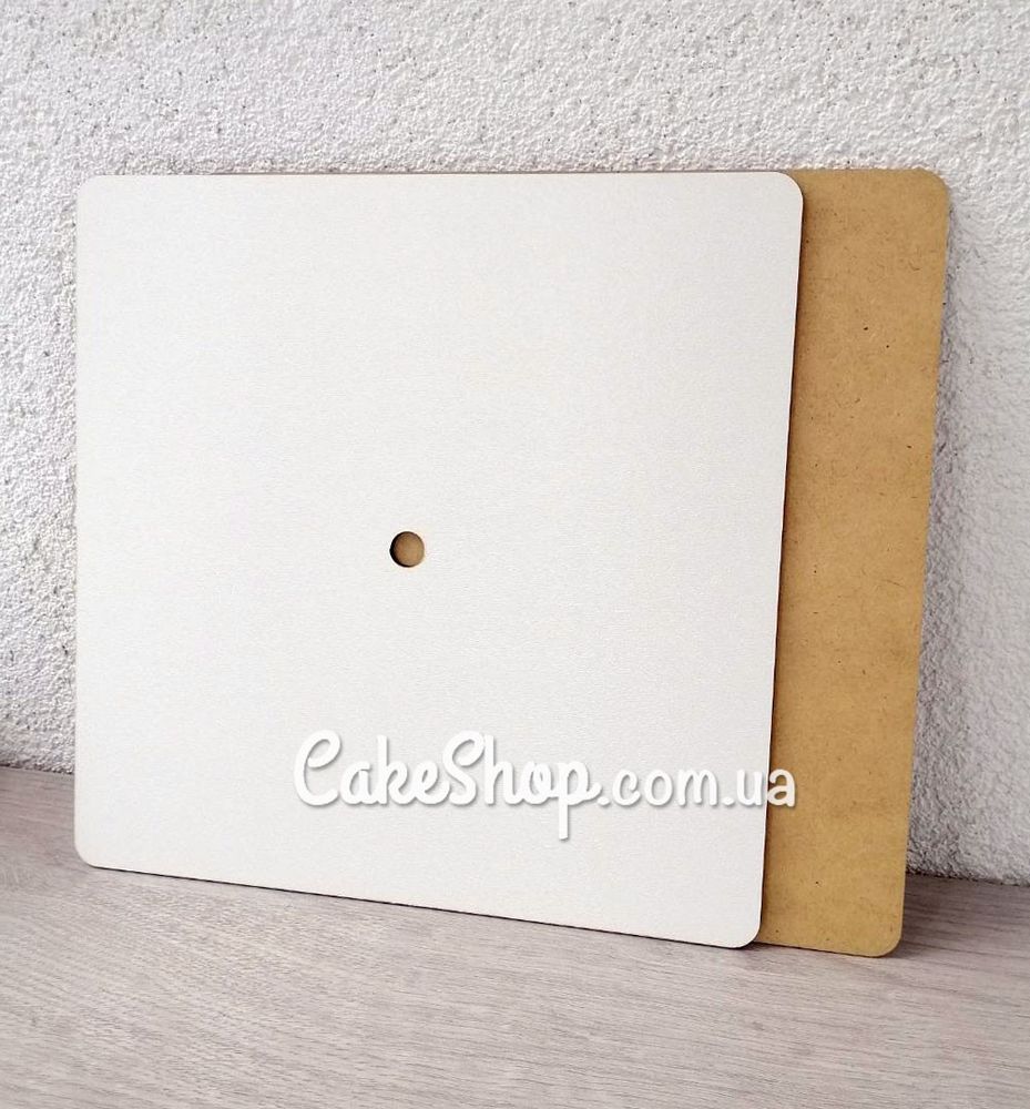 Ціна на Підложка для багатоярусного торта з отвором квадратна ДВП, біла 25х25см дорівнює 22 грн.