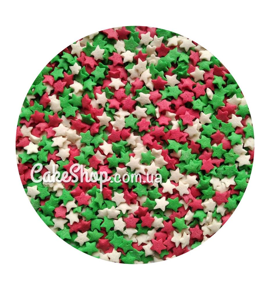 Ціна на Посипка Зірочки білі, зелені, червоні, 50 г дорівнює 20 грн.