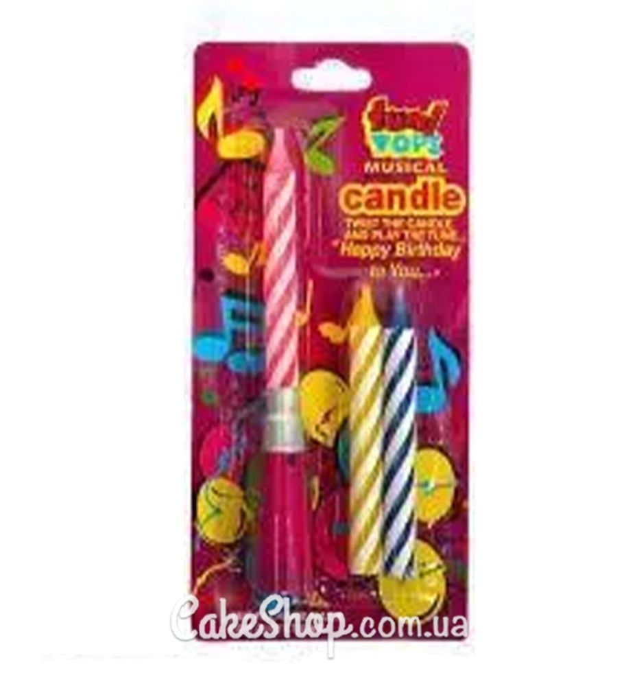Музична свічка із запасними свічками ( 2 шт ). Тортова свічка програє мелодію "Happy Birthday to you". У комплекті йдуть дві запасні свічки, що заміняються, таким чином таку вітальну свічку можна використовувати кілька разів!