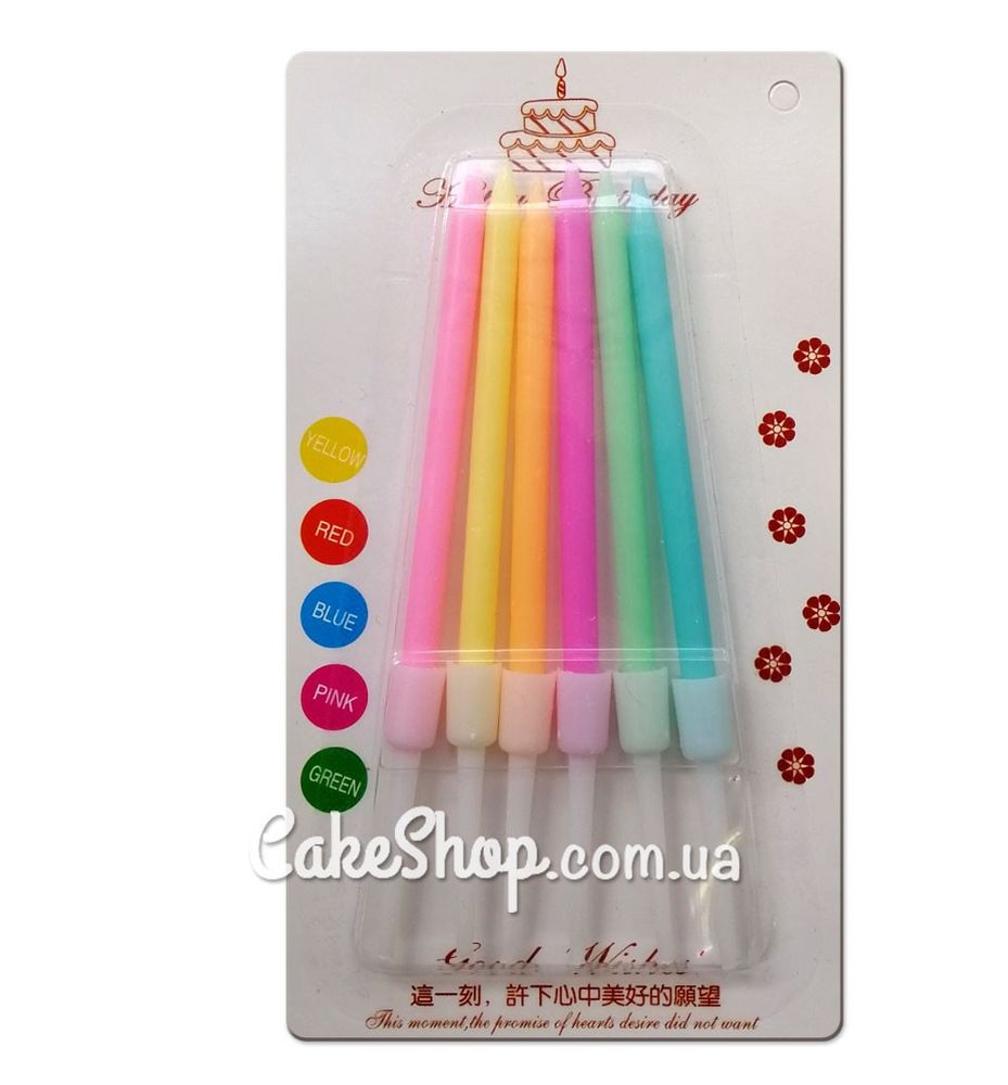 Різнокольорові святкові свічки прикрасять будь-який торт і зроблять атмосферу неповторною, а Ваше свято незабутнім. Свічки виконані з парафіну, у верхній частині свічі знаходиться фітіль, який підпалюється. Свічки без ніжки, вставляються безпосередньо в торт.
