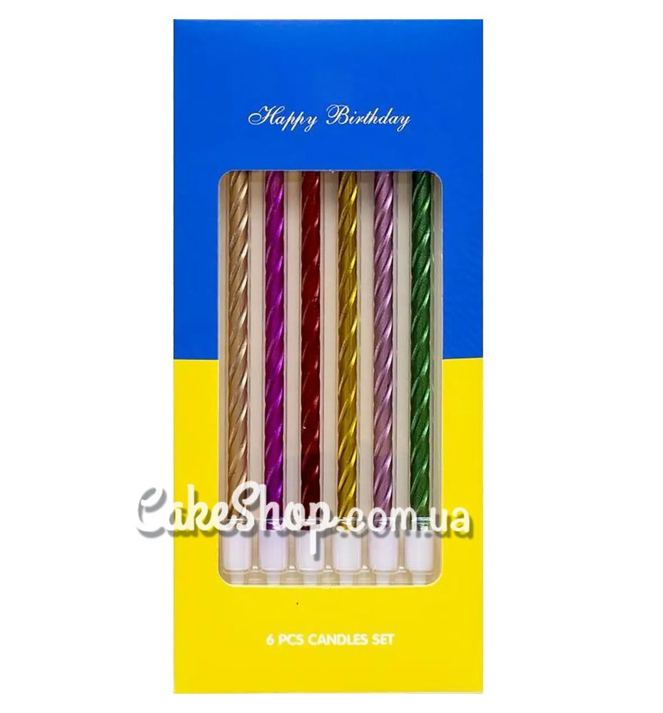 Ціна на Свічки тортові Спіраль Асорті металік 12 см, 6 шт дорівнює 25 грн.