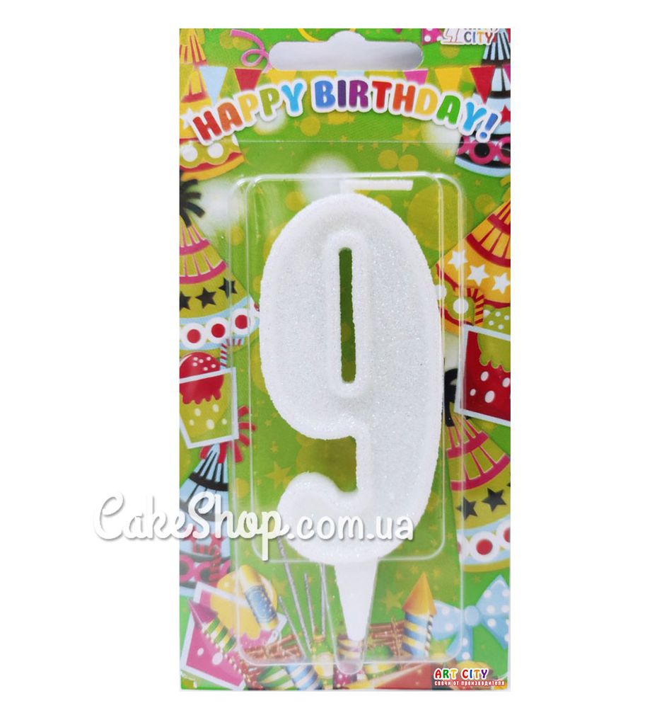 Ціна на Тортова свічка цифра Класика білий блиск - 9 дорівнює 12 грн.